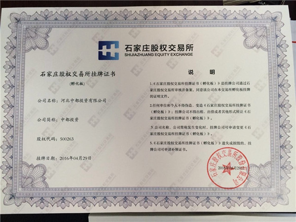 河北中都投資有限公司是石家莊股權(quán)托管交易中心推薦機(jī)構(gòu)會(huì)員單位,對(duì)企業(yè)在上股交掛牌提供眾多專項(xiàng)服務(wù),法律咨詢服務(wù)等。幫助更多的企業(yè)能夠上市、融資提供了更多的是選擇機(jī)遇。2016年四月,在股權(quán)交易所,成功掛盤,股權(quán)代碼【500263】;2016年十一月,2017年、2018年、2019年躋身獲得亞洲中金聯(lián)盟會(huì)員單位等榮譽(yù)稱號(hào)。
